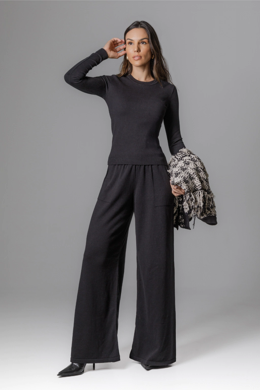 Dica de uso: Combine com uma blusa ajustada para equilibrar a silhueta ou uma camisa oversized para um visual moderno e despojado. Ideal para composições sofisticadas sem abrir mão do conforto.