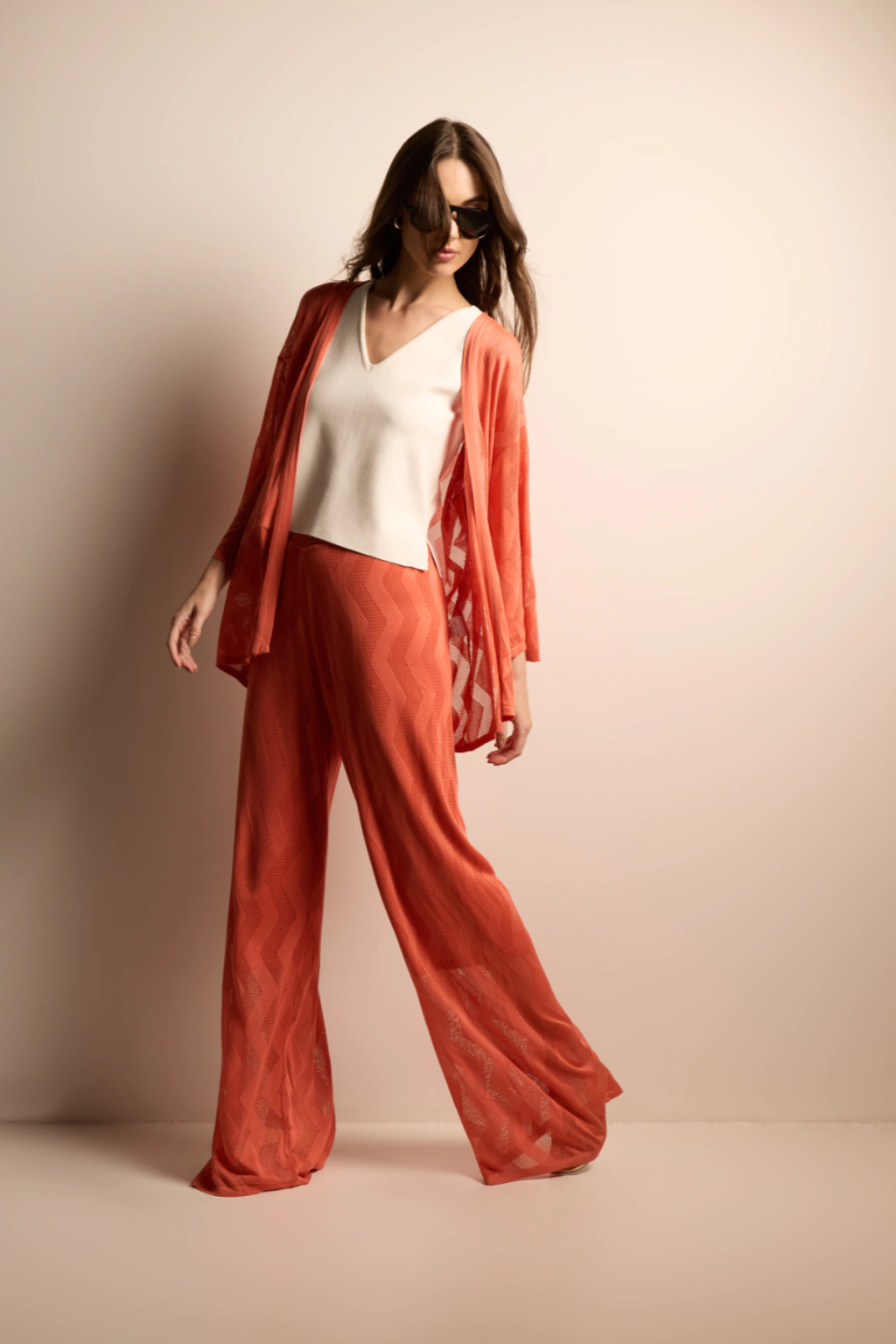 A Calça Parquet une leveza, conforto e um toque de sofisticação. Confeccionada em micromodal, possui caimento fluido e toque extremamente macio, ideal para acompanhar o movimento do corpo. Sua modelagem pantalona é valorizada pela padronagem em zig zag, que adiciona modernidade e estilo à peça, perfeita para compor produções elegantes ou descontraídas.