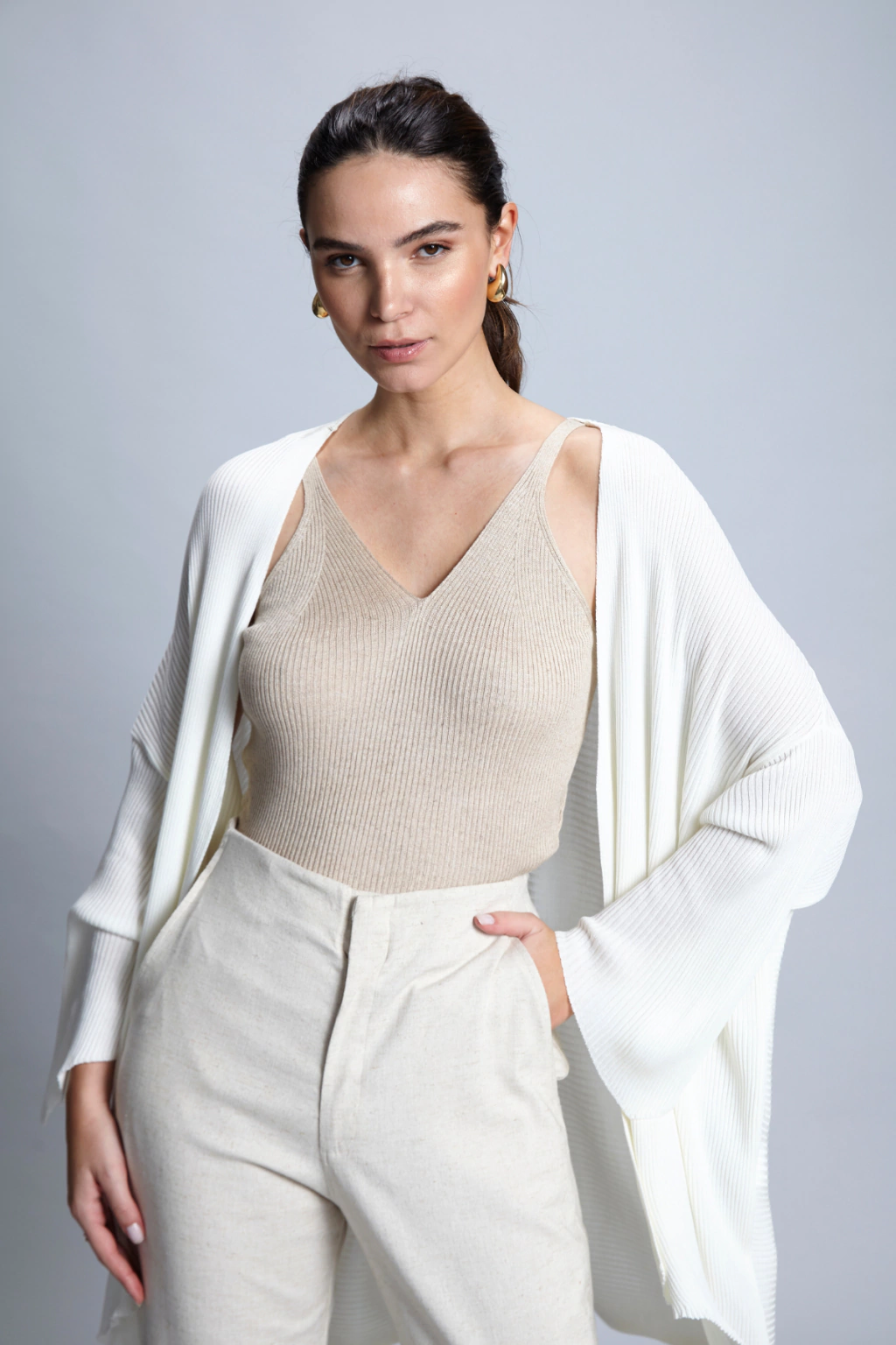 O Casaco Friso combina elegância minimalista e conforto absoluto. Confeccionado em 100% modal, oferece toque extremamente macio, caimento fluido e excelente respirabilidade. Sua modelagem ampla com mangas acabadas em “V”, tricô canelado garante versatilidade, podendo ser usado como sobreposição em produções casuais ou sofisticadas durante todas as estações.
