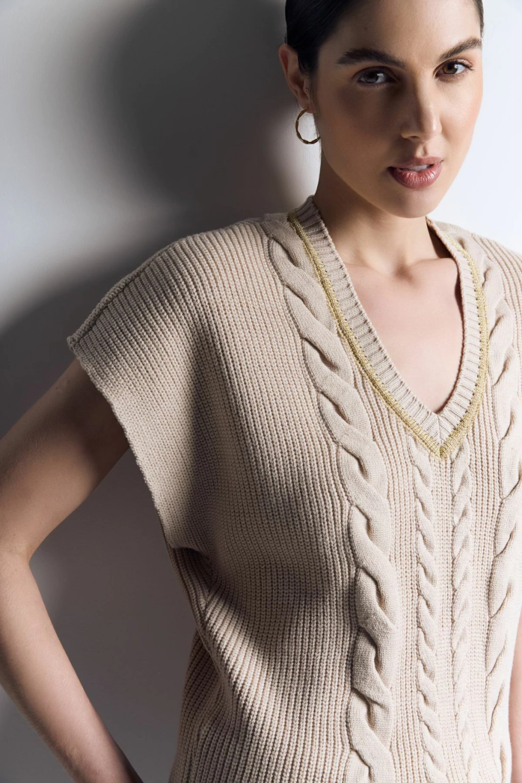 O Colete Frizzie Tranças é perfeito para criar produções elegantes e modernas nos dias mais amenos. Com textura de tranças em tricô, decote V e detalhe metálico dourado, traz um toque de sofisticação ao visual. Sua modelagem versátil permite combinações tanto com camisas quanto com blusas de gola alta.